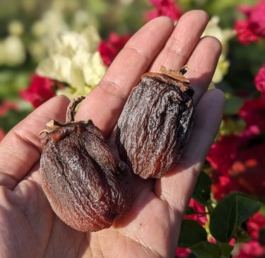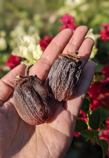 We had a few unripe persimmons at hand, so we tried to dry them for a few weeks and see what we'd get. We were pleasantly surprised when they started shrinking and forming a new "skin" within the first week (they had been washed and peeled beforehand). They were massaged gently a few times a week to coax out the sugars to the surface, and in about four weeks, we could clearly see the sugars crystallize on the skin.